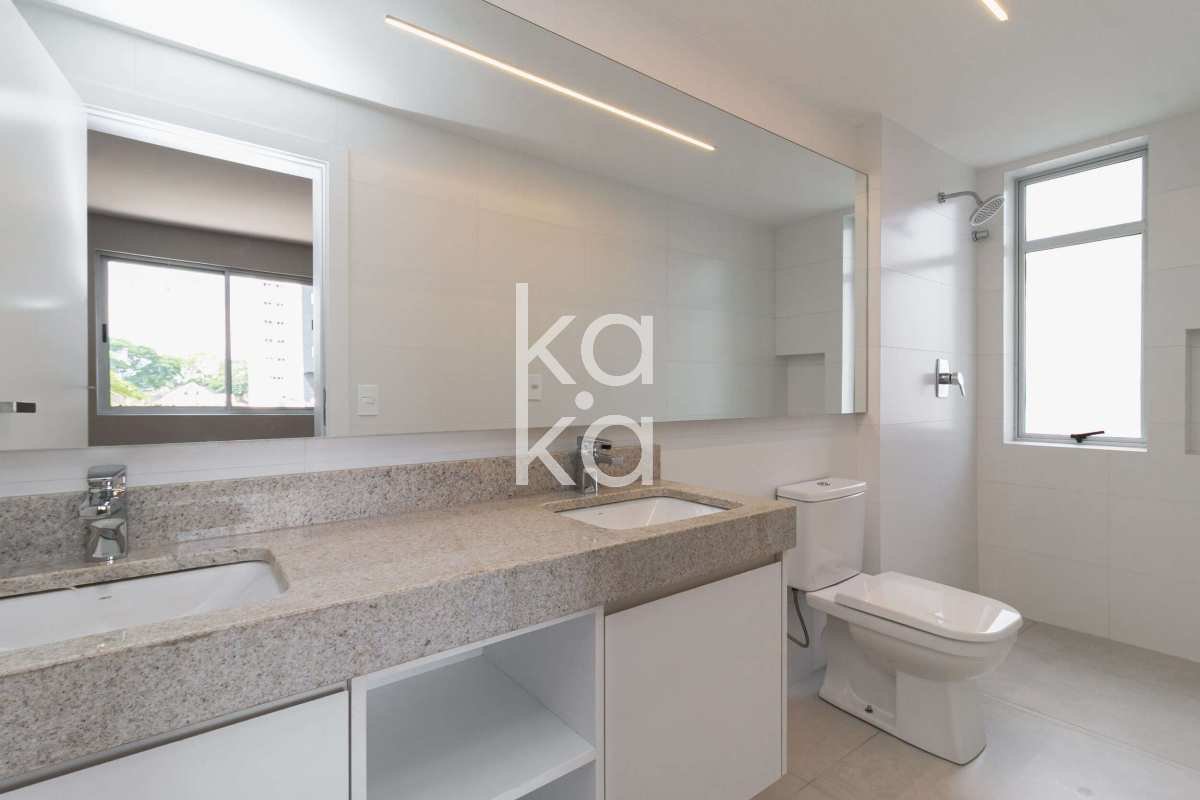 Piso laminado nas áreas íntimas e porcelanato nas salas, cozinha e banheiros