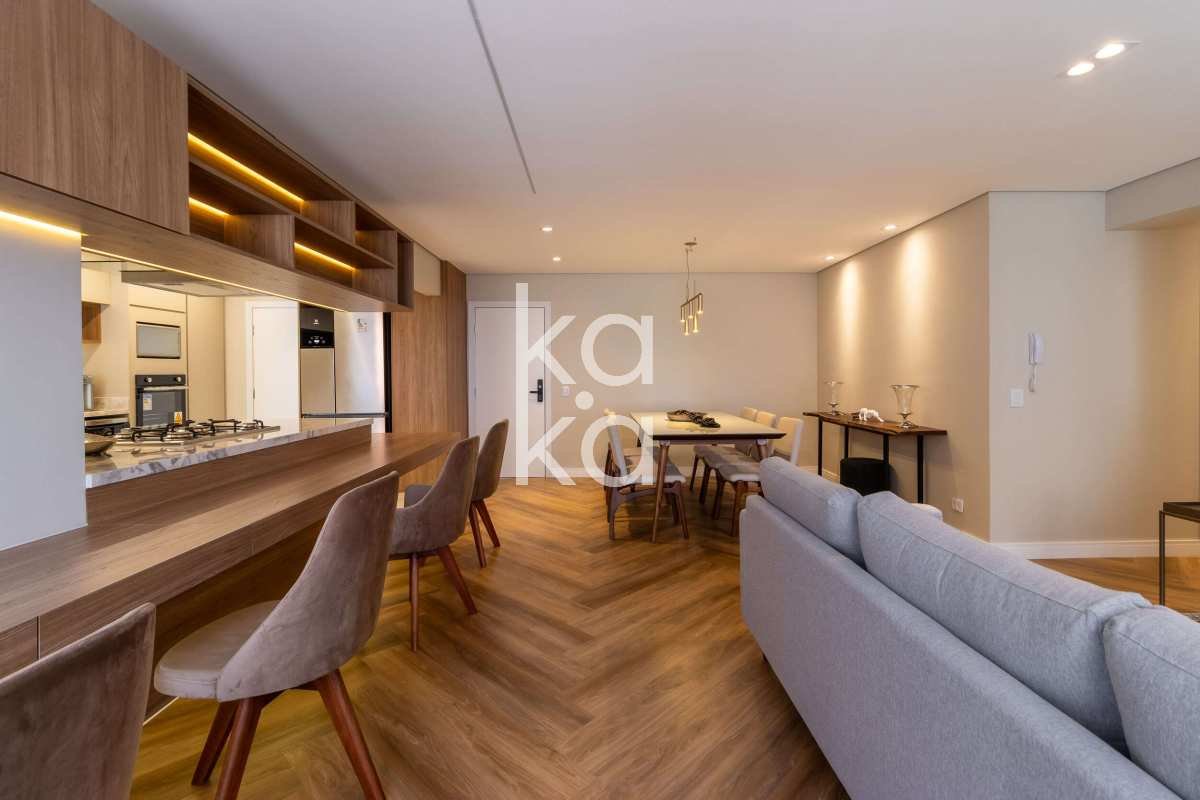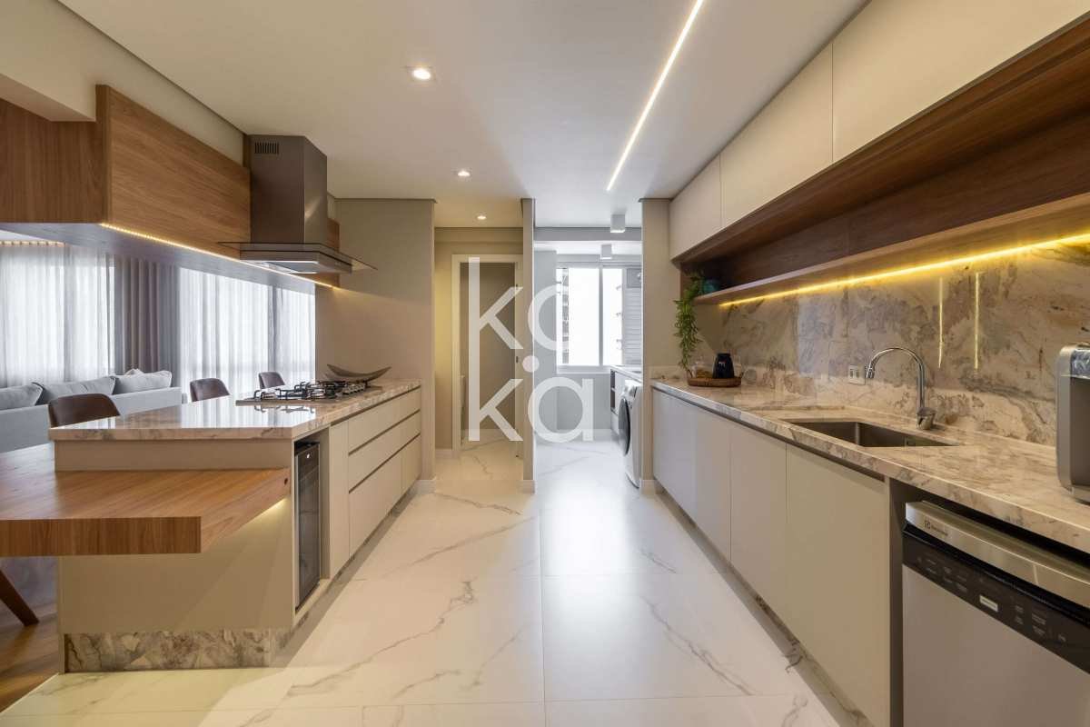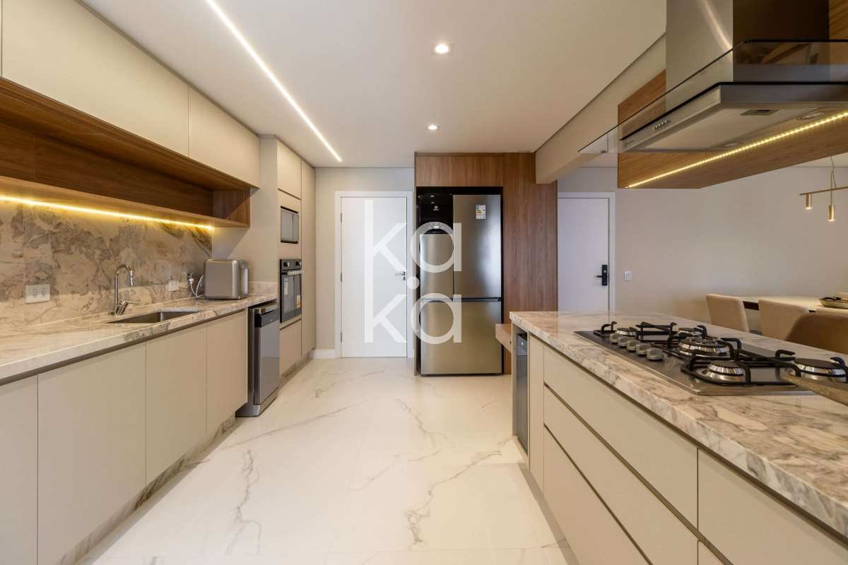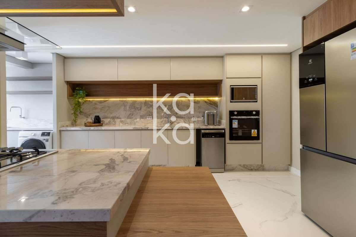 Cozinha americana equipada (geladeira, forno, cooktop, micro-ondas, coifa, adega e lava e seca)